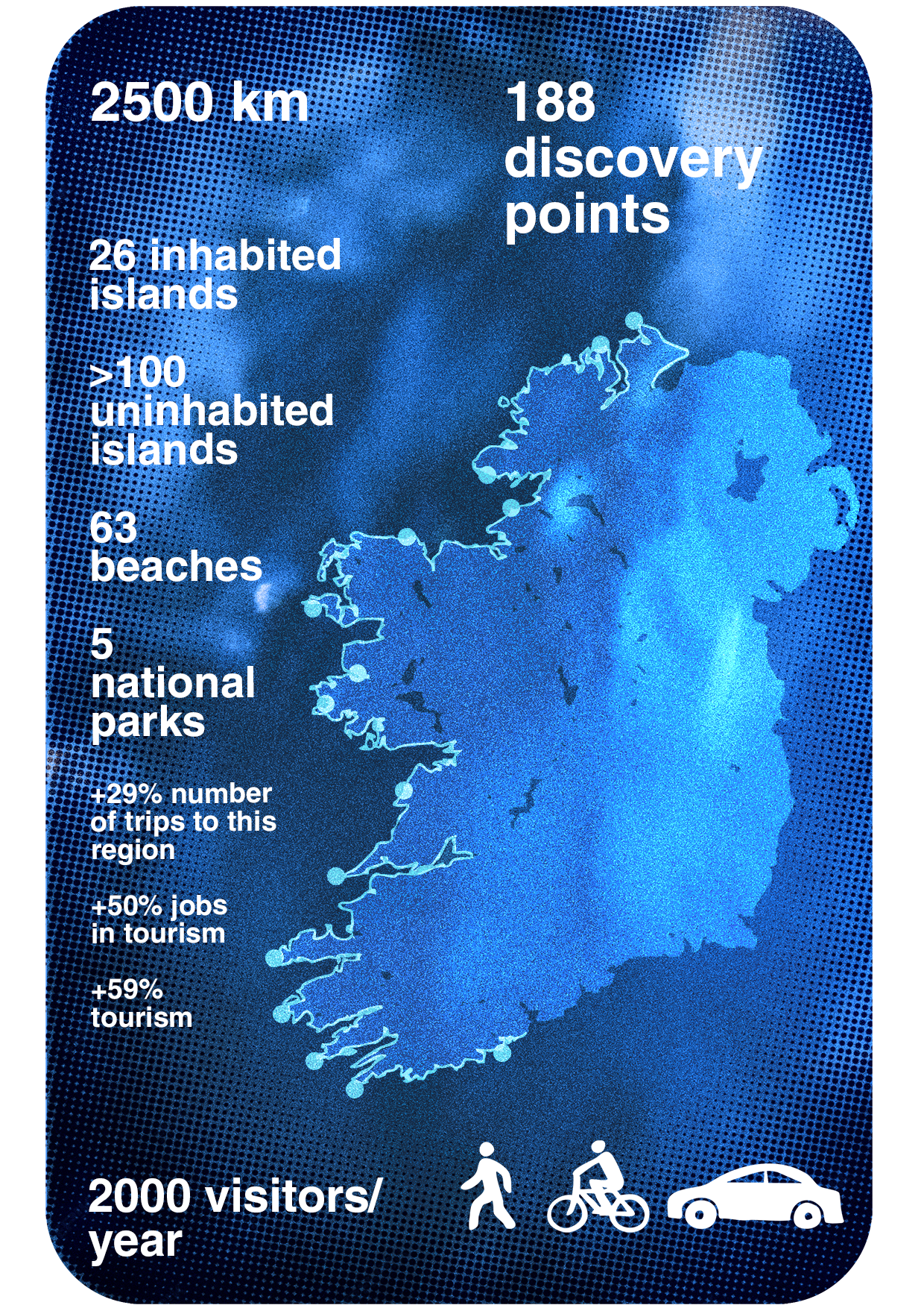 To mitigate the lingering effects of the global financial crisis, which according to Miriam Kennedy, head of the Wild Atlantic Way, had “decimated” tourism in the west of Ireland, Fáilte Ireland (Ireland’s National Tourism Development Authority) devised a “brand” to promote the region and draw visitors to its existing attractions. The Wild Atlantic Way is a route over 2,500 kilometres long, featuring 188 discovery points. The project’s major investment was in road signage and promotion. Since its inception in 2014, tourism numbers to the west of Ireland have increased by more that two million visitors. The Wild Atlantic Way is now one of the biggest attractions on the island, with over half of all visitors to Ireland making at least one stop on any visit.